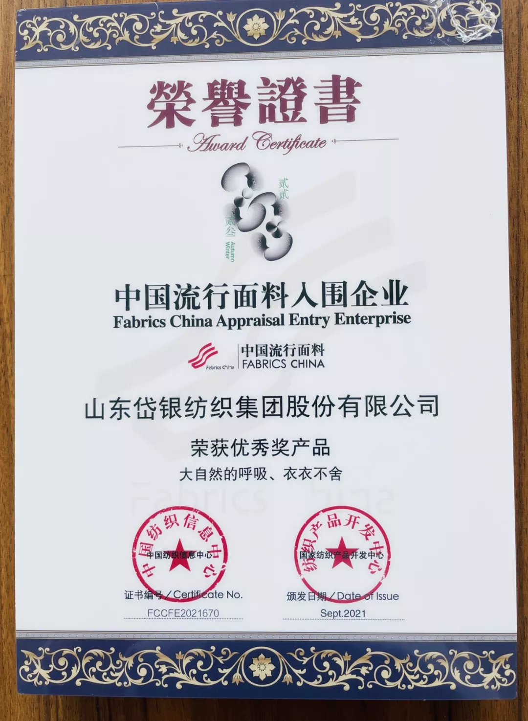 近日, 在由中国纺织工业联合会主办的2021中国国际面料设计大赛、第46届(2022/2023秋冬)中国流行面料入围评审活动中,岱银集团纺织研究院参评的面料“大自然的呼吸”和“衣衣不舍”荣获中国流行面料优秀奖。中国国际面料设计大赛是中国纺织行业最具权威的纺织设计专业赛事,宗旨是鼓励和推进以市场为导向的纺织产品创新,提升创新产品的市场竞争力。此次入选的两款面料产品主打汉麻元素,注重面料舒适性和功能性的有机结合,面料在穿着过程中舒适透气,同时采用长丝短纤复合纺纱技术与抗菌长丝复合,达到持久抗菌的效果。