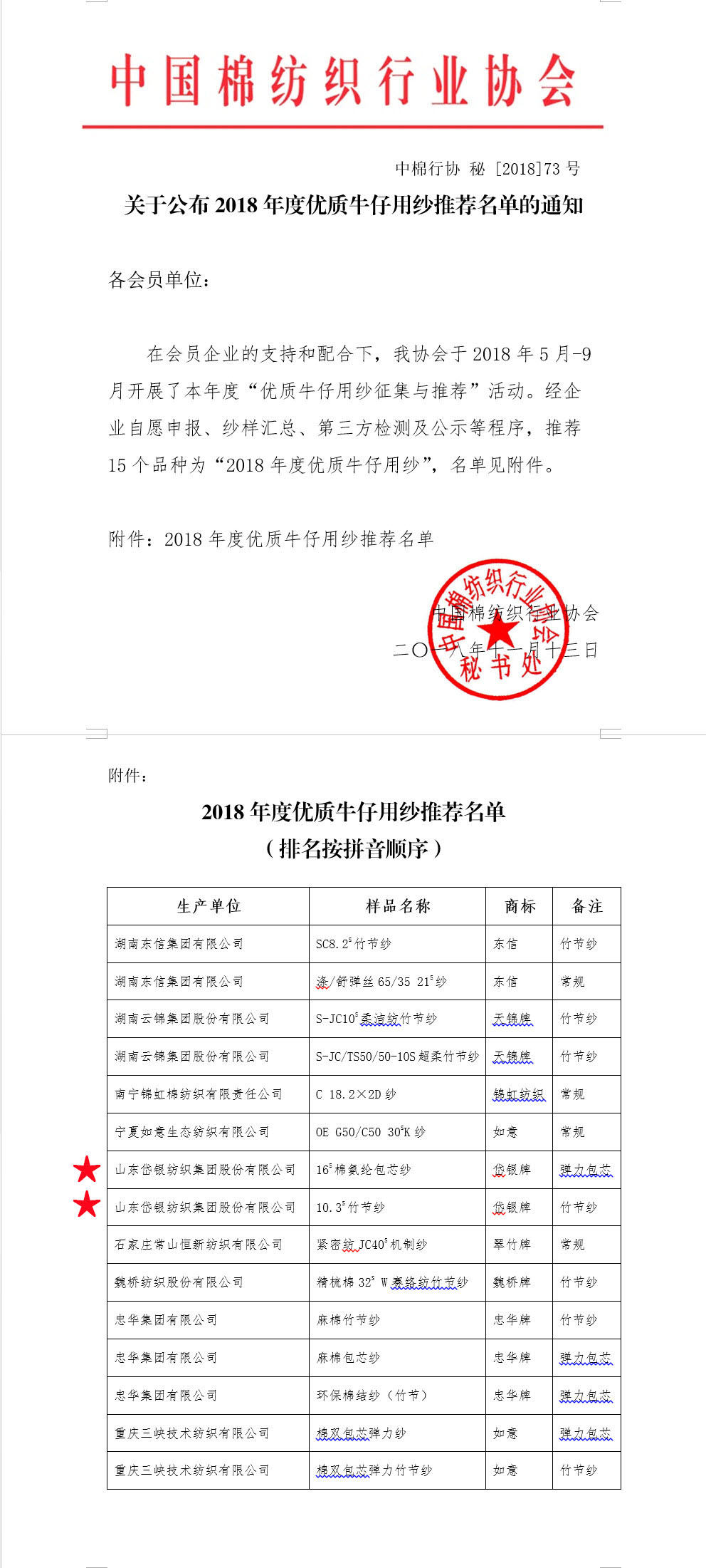 岱银牌牛仔用纱荣登“2018年度优质牛仔用纱推荐名单”